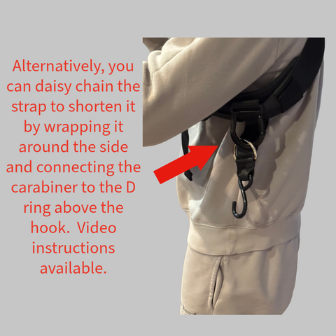 *General- Set the hook straps by attaching the carabiners to the fabric loops hanging on the sides of the harness. It is not recommended to attach them directly to the bottom D-rings (those are for tube-style resistance bands only). Alternatively, you can use the daisy-chain method to increase the range of motion, which I explain below.